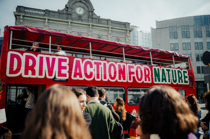 A striking red, open-top double-decker bus – emblazoned with the slogans “Stop the OmniBus” and “Drive Action for Nature” – rolled through the EU quarter today in a highly visible protest organised by the #HandsOffNature campaign. The stunt was a response to the European Commission’s deregulation drive, warning of a dismantling of environmental  laws under the guise of “simplification”.